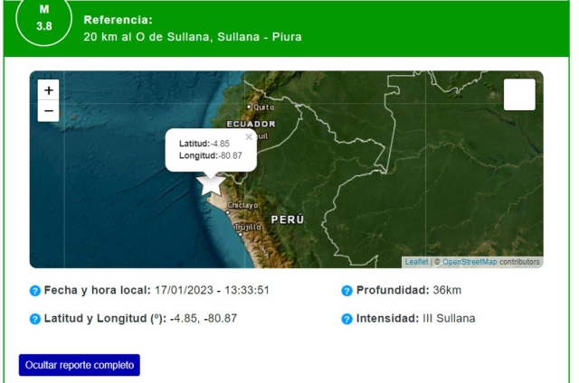 ERP. Un sismo de magnitud 3.8 se sintió en la provincia de Sullana. De acuerdo a la información del Instituto Geofísico del Perú, el evento se produjo a las 13:33:51 horas; a una profundidad de 36 kilómetros y a unos 20 al Oeste de Sullana. Tanto en el 2021 como en el 2022 este tipo de movimientos telúricos se han presentado en la zona norteña, solo con pequeños daños materiales y sin ninguna víctima humana.