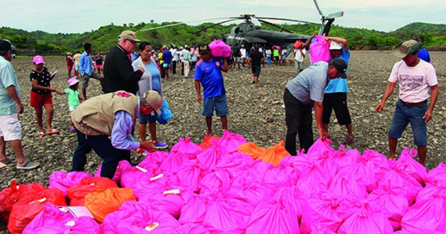La ayuda entregada, ha consistido sobre todo en paquetes familiares de alimentos, de 25 kilos cada uno, conteniendo víveres de primera necesidad como arroz, azúcar, fideos, menestras, leche, aceite, atún, avena, cocoa y agua embotellada, todo esto para el sostenimiento de una familia de 5 personas por una semana, así como repelentes y dulces para los niños.