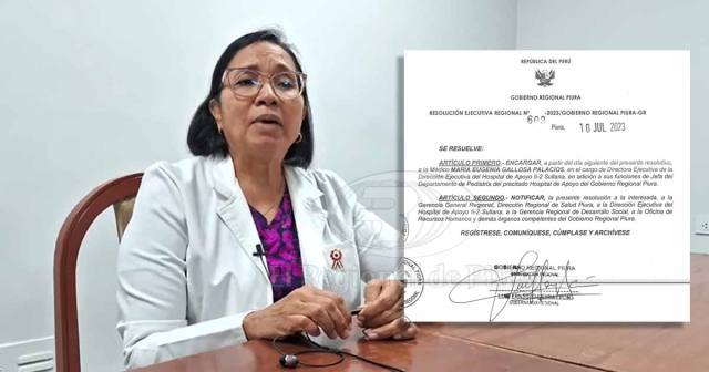 Ella se desempeña actualmente como Jefe del Departamento de Pediatría, la encargatura del cargo de Director del Hospital Apoyo II de Sullana, lo hará en adición a su función principal. Es necesario indicar que este hospital anteriormente tuvo como su representante al actual director regional de salud.