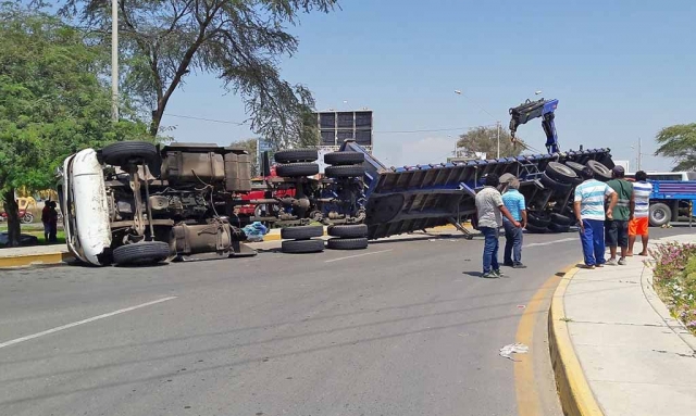 ERP. Un camión que transportaba papel perdió el control volcando aparatosamente en el óvalo de ingreso a la ciudad de Sullana, a la altura del centro comercial Real Plaza, se informó.