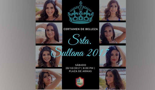 ERP. En tradicional certamen de belleza por aniversario de Sullana. La noche de este sábado 28 de octubre se realizará la elección y coronación de "Señorita Sullana 2017" desde las 8:00 p.m. en la Plaza de Armas de la ciudad. Ocho serán las finalistas que harán gala de su belleza y elegancia en la pasarela, en el tradicional y oficial certamen de la Perla del Chira.