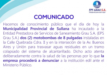 ERP. La EPS Grau, responsable de prestar el servicio de agua potable y desagüe en la provincia de Sullana denunció que la Municipalidad Provincial de esta localidad, incautó dos motobombas de 8 pulgadas, las cuales se encontraban instaladas en la calle Quebrada cuadra 2 y en la Intersección de la Avenida Buenos Aires y Unión, para trasvasar aguas residuales en un tramo colapsado.