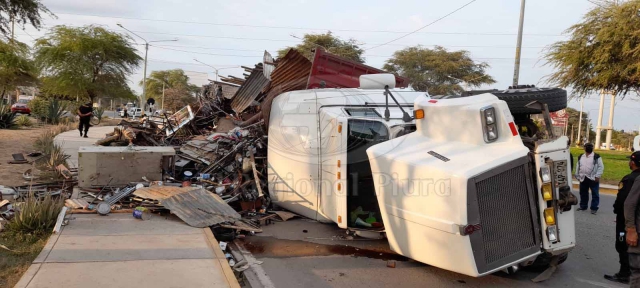 ERP. Un tráiler fletado con chatarra que iba con dirección a Lima, se volteó en el óvalo de la avenida Panamericana Norte, altura de la ciudad de Sullana, cerca al centro comercial Promart. Según información obtenida por este medio, la mercancía de reúso que llevaba el camión con Placa de Rodaje T4P-874 era de propiedad del señor Luis Avellaneda.