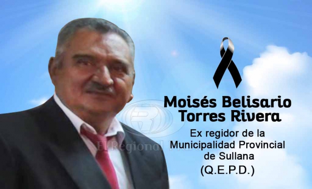 ERP. Moisés Belisario Torres Rivera (69), fue un político natural de Sullana. Tras diversas semanas de estar en recuperación, la enfermedad le causó daños irreversibles y falleció. Se desempeñó como regidor de la Municipalidad Provincial en dos oportunidades, de la cual fue un activo impulsor de diversas obras en beneficio de su terruño y sobre todo de la urbanización Santa Rosa donde residía.