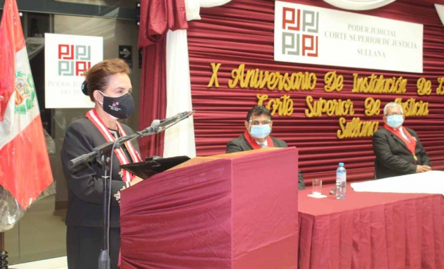 ERP. La presidenta del Poder Judicial, Elvia Barrios Alvarado pidió a los jueces y juezas del país tener un espíritu renovador para producir más y trabajar con honestidad y transparencia. La jueza suprema presidió los actos protocolares que se realizaron de manera semi presencial en el marco de la celebración por el X Aniversario de Instalación de la Corte Superior de Justicia de Sullana.