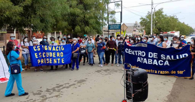 ERP. Personal de Salud del ámbito de la subregión de salud Luciano Castillo Colonna que tiene su sede en la ciudad de Sullana, se aposentaron en los exteriores del local institucional para reclamar el pago del bono y otros derechos que les corresponde por haber prestado servicios en la etapa de la pandemia. Duras frases contra el Jefe de Recursos Humanos y Gerente Subregional Leonardo Saba Flores fueron parte de la protesta.