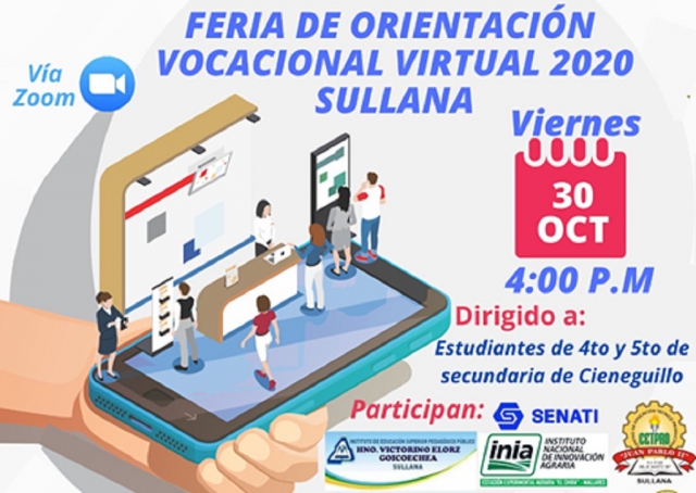ERP. Una importante jornada para los alumnos del nivel secundario del sector Cieneguillo, provincia de Sullana se estará realizando este 30 de octubre a las 4 de la tarde. Mediante el aplicativo Zoom, se llevará adelante la “I Feria Vocacional Virtual 2020 – Cieneguillo”, evento que contará con la participación de universidades, institutos, Senati, Escuela de la Policía, INIA, entre otras.