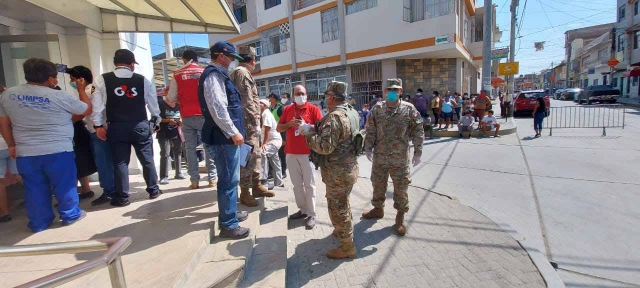 ERP. A fin de evitar la aglomeración de los beneficiarios de Pensión 65, el bono excepcional por el Covid-19, y otros usuarios en el Banco de la Nación, la Fiscalía de Prevención del Delito junto al Ejército, realizaron, esta mañana, coordinaciones y acciones en la sede de este banco de Sullana.