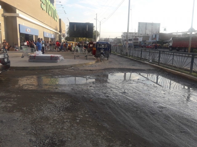 ERP. Como muchas calles de la ciudad de Sullana, la vía exterior del centro comercial Tottus, sigue en franco deterioro. El año pasado realizamos un informe tras una lluvia que dejó evidente la vía destruida y acogiendo el pedido de varios clientes, se requirió que se solucione, se recupere la carpeta asfáltica y se evite el empozamiento de las aguas de lluvia; transcurrido el tiempo, el problema sigue igual.