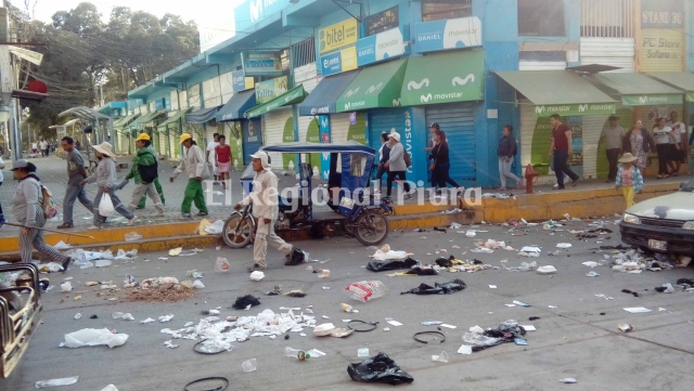 ERP. Trabajadores de la Municipalidad Provincial de Sullana, realizan protesta por las diferentes puntos de la ciudad, debido a la falta de pago de sus sueldos. La medida de fuerza que se inició el día anterior conllevó a acciones más violentas como arrojar basura por diferentes calles de la ciudad, para luego dirigirse a la comuna local y continuar con su protesta.