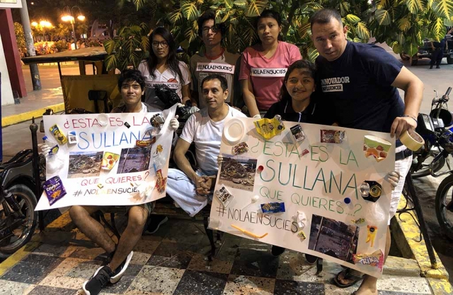 ERP. La gente que paseaba el domingo 10 al anochecer en la Plaza de Armas de Sullana quedó sorprendida cuando un grupo de jóvenes con carteles en sus camisetas con la etiqueta (hashtag) #nolaensucies comenzó a recoger la basura que se encontraba en los jardines alrededor de la pileta: ¿serán empleados de la municipalidad? ¿acaso pertenecerán a alguna ONG? ¿de qué grupo juvenil serán?