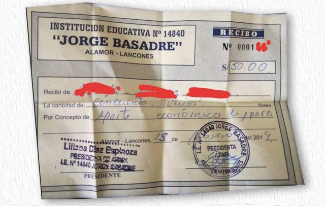 ERP. Pese a las condiciones climáticas y las prohibiciones respectivas del Ministerio de Educación, algunos padres de familia del colegio N° 14840 Jorge Basadre del distrito de Lancones de la provincia de Sullana, indicaron que todos los años son obligados a cancelar una cuota al inicio del año escolar cuyo uso y disposición no se encuentra perfectamente determinada porque nadie explica.