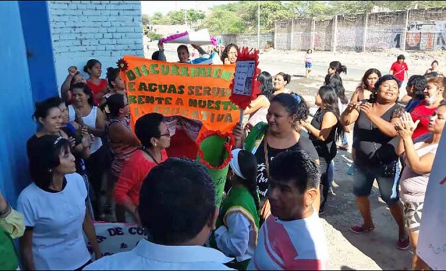 ERP. Cansados de que sus hijos tengan que soportar a diario los malos olores y sortear las aguas de desagüe para llegar al colegio, los padres de la institución educativa N° 14783, ubicada a inmediaciones del Canal Vía y de la IEI 512, realizaron una airada protesta en el frontis de la planta de tratamiento de agua potable de la empresa EPS Grau, ubicada en la carretera La Tina.