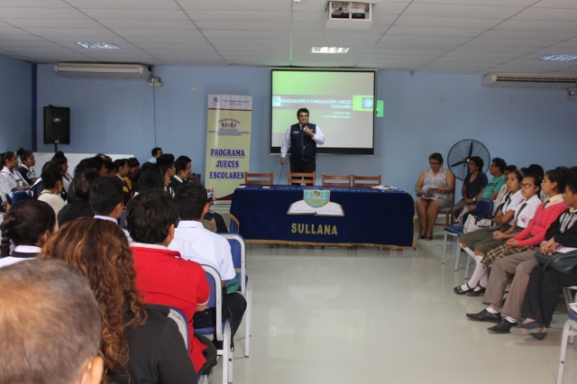 ERP. El juez superior y jefe de la Oficina Desconcentrada de la Magistratura de la Corte Superior de Justicia de Sullana Dr. Jorge Washington Alva Inga capacitó a más de un centenar de jueces escolares, representantes de instituciones educativas del ámbito de la UGEL de Sullana sobre "Técnicas de negociación y conciliación".