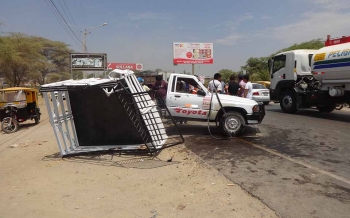 ERP. Tres personas heridas, tras el violento choque entre conductor de un pesado volquete que chocó y arrastró una camioneta y un automóvil a escasos metros del denominado ‘Ovalo de la Muerte’, al ingreso de Sullana.