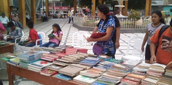 Durante la primera jornada del evento "Chapa tu libro y ponte a estudiar" se recolectaron una diversidad de libros y colecciones de otras materias, los mismos que se pusieron en consulta para el público lector en la Plaza "Simón Morales".