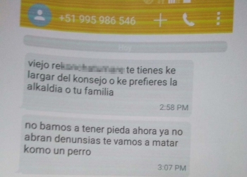 En una nota de prensa, la comuna bellavistina ha explicado que en el mensaje de texto, en el que figura el número del remitente autor de la amenaza,, se pueden leer literalmente las frases: " VIEJO RE... TE TIENES KE LARGAR DEL KONSEJO O KE PREFIERES LA ALKALDIA O A TU FAMILIA ". El Alcalde recibió el apoyo por parte de todos los regidores, así como de la comunidad organizada, entendiendo que hoy le está sucediendo al alcalde y mañana puede ser cualesquier otra persona.