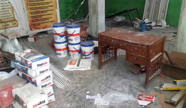 Un grupo de vecinos de este distrito, alertó que en este local se encuentran cables de energía expuestos, ladrillos y tubos de plástico en los pasadizos y otros desperfectos que podrían ocasionar un accidente.