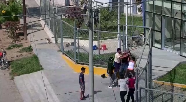 Lo interceptan en la puerta y el hombre de polo amarillo, lo agarra y arrincona en las rejas, mientras las mujeres y adolescentes, lo agarran a puñetes y pedradas. En eso aparece otro sereno, y también es agredido furiosamente.