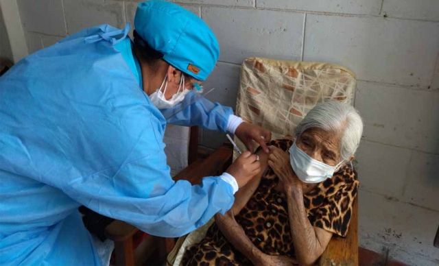ERP. La señora Carmen Nunura de Rumiche, de 100 años, es una de las mujeres más longevas en recibir la primera dosis de la vacuna contra el Coronavirus en el distrito de Bellavista, en la provincia de Sullana.