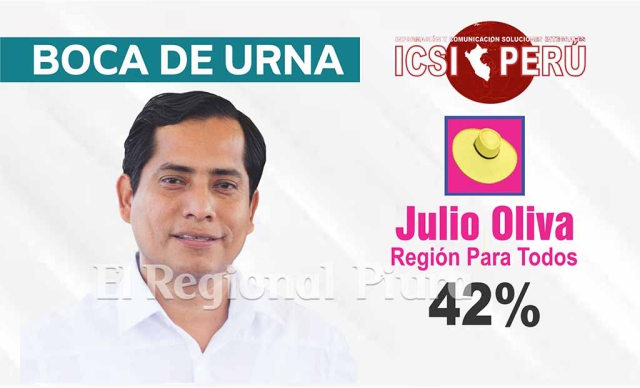 ERP. De acuerdo a la encuesta a ‘Boca de urna’ realizada por la encuestadora Icsi Perú, el candidato Julio Oliva de la organización política Región para Todos sería el virtual alcalde del distrito de Bellavista, quien habría obtenido el 42% de los votos.