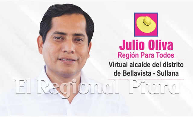 ERP. Al 100% de actas procesadas por la ONPE, el Ing. Julio Oliva Reto, se convierte en el nuevo alcalde del distrito de Bellavista, provincia de Sullana; para el periodo 2023-2026. En el conteo oficial por la Oficina Nacional de Procesos Electorales, obtuvo 10,033 votos.
