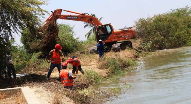 La eliminación de los desechos se realiza con volquetes. Estos trabajos permiten el mejoramiento de la sección hidráulica del Canal Miguel Checa y la optimización del servicio de riego de la Comisión de Usuarios Miguel Checa en el valle del Chira.