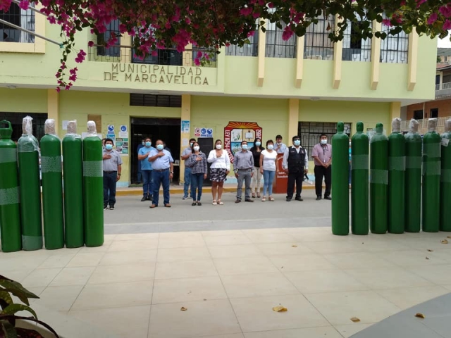 ERP. Autoridades y pobladores de este distrito, encabezados por el alcalde distrital Augusto Chiroque Nunura, participaron en la bendición de 20 balones de oxígeno que fueron adquiridos por el Comité Covid-19 distrital - Marcavelica, conjuntamente con otros equipos de protección personal, que servirán para atender de manera más efectiva a las personas contagiadas con el temible Covid-19.