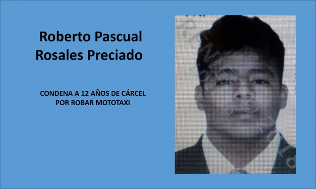 ERP. Pena severa para delincuente en la provincia de Sullana. El delincuente Roberto Pascuali Rosales Preciado de 27 años, fue condenado a 12 años de cárcel por el Juzgado Penal Colegiado de Sullana, que lo halló culpable del delito de robo agravado, tras apropiarse de una motocar, condena que es considera como ejemplar para disuadir en este tipo de hechos.