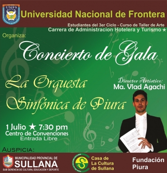 ERP. Este viernes 01 de julio a partir de las 7:30 p.m. en el Centro de Convenciones se presenta el Concierto de Gala denominado “La orquesta Sinfónica, sonidos que nutren el alma”, a cargo de la Orquesta Sinfónica Municipal De Piura, bajo la dirección Artística de Ma. Vlad Agachi.