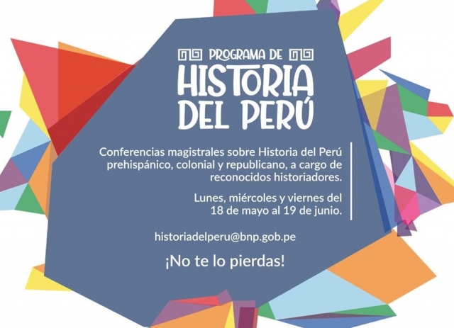 ERP. La Biblioteca Nacional del Perú (BNP) continúa con brindarle opciones culturales y académicas a la ciudadanía, durante el aislamiento social obligatorio. Por tal motivo, presenta el Programa de Historia del Perú, que se transmitirá en vivo a través de la plataforma Facebook de la institución, del 18 de mayo al 19 de junio, todos los lunes, miércoles y viernes de 7:00 a 8:30 p.m.