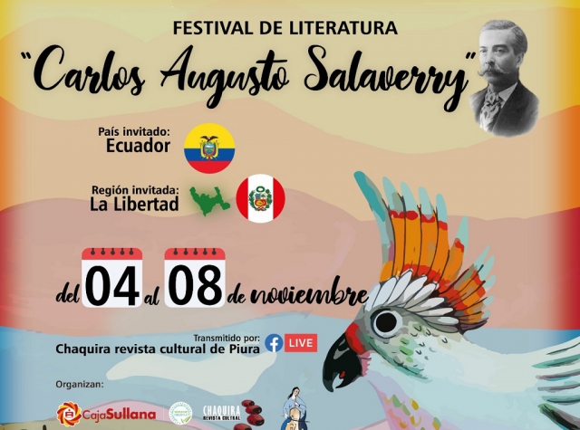 ERP. Del 4 al 8 de noviembre se realizará de manera virtual el Festival Literario “Carlos Augusto Salaverry”, el mismo que es una actividad en homenaje a la provincia de Sullana que cumplirá su 109 aniversario en la presente semana. Será transmitido por la página de Facebook de Chaquira, revista cultural de Piura.