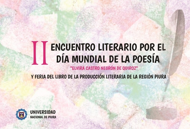 ERP. La Universidad Nacional de Piura en el marco del Día Mundial de la Poesía llevará a cabo el II Encuentro literario Elvira Castro Negrón de Quiroz y Feria del libro de la producción literaria de la región Piura, el día 21 de marzo de 2019, a horas 10 a.m., en la Facultad de Derecho y Ciencias Políticas de esta Universidad.