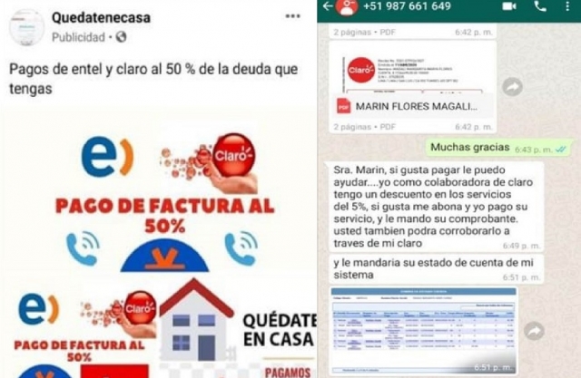 ERP. A tener cuidado en estos momentos de mucha tensión que viven los peruanos. Claro alerta a sus usuarios de la existencia de publicaciones falsas en redes sociales en las que, haciendo uso ilegal del nombre de la marca, se anuncia el pago de recibos pendientes de servicios móviles o del hogar abonando sólo el 50 % del costo total de la deuda.