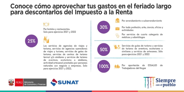ERP. Si eres trabajador independiente o en planilla y este fin de semana largo tienes previsto salir o realizar un viaje al interior del país, debes conocer que puedes aprovechar los gastos que efectúes en restaurantes, bares, hoteles o servicios de turismo y artesanía, entre otros, para descontarlos del pago de tu Impuesto a la Renta o, incluso, de ser el caso, obtener una devolución el año siguiente.