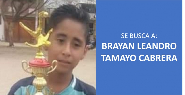 ERP. Un menor de edad, residente en el distrito Veintiséis de Octubre, de la provincia de Piura, fue reportado por sus familiares como desaparecido desde el último 8 de marzo. Se trata de Brayan Leandro Tamayo Cabrera de 13 años de edad, cuya denuncia policial respectiva fue presentada por su señora madre Brenda Cabrera, para que quienes tengan información la hagan llegar.
