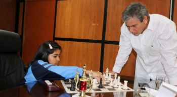 La pequeña representante del deporte ciencia demostró toda su habilidad en el tablero, una exhibición con el gobernador regional, Reynaldo Hilbck, y el director regional de Educación, Pedro Periche Querevalú; quienes se comprometieron a apoyarla.