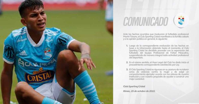 “Luego de la correspondiente evaluación de los hechos en base a la información obtenida hasta el momento, el Club Sporting Cristal ha decidido proceder con la separación del futbolista del equipo profesional de fútbol masculino, suspendiendo de manera integral toda actividad profesional del deportista”, se lee en el comunicado del conjunto rimense.