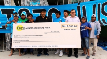 ERP. En cumplimiento de su plan de gobierno de orientar el apoyo al deporte, el gobernador regional Reynaldo Hilbck Guzmán, a través del consejero delegado, ingeniero Hermer Alzamora Román entregó, este mediodía, el cheque por la suma de siete mil nuevos a los dirigentes del Club Deportivo La Bocana Parachique, representante de la región en la lid nacional por ingresar al fútbol profesional.