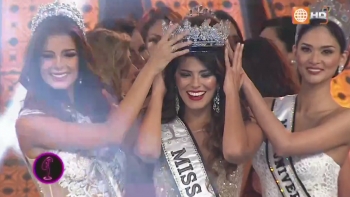 Laura Spoya Miss Perú 2015, entregó a Valeria Piazza la corona de Miss Perú Universo, certamen que se realizó en el Centro Ecológico de Producción de América Televisión en Pachacámac.