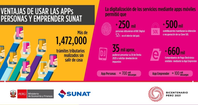 De esta manera, mediante las aplicaciones, APP Personas, destinada a las personas naturales; y el APP Emprender, orientado a los emprendedores, se impulsó la formalización facilitándoles a estos contribuyentes el inicio de sus actividades económicas, para la prestación de servicios o la marcha de un negocio.