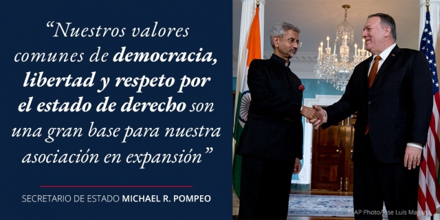 ERP. (Por ShareAmerica) Estados Unidos y la India están “forjando lazos más profundos y fuertes entre nuestras dos naciones”, dijo el 18 de diciembre el secretario de Estado Michael R. Pompeo. Junto con el secretario de Defensa de Estados Unidos Mark Esper, Pompeo recibió en el Departamento de Estado al ministro de Asuntos Exteriores de la India Subrahmanyam Jaishankar y al ministro de Defensa Rajnath Singh.