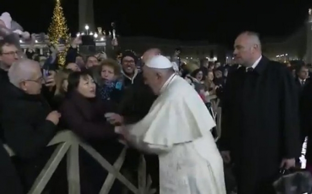 ERP. El Papa Francisco, tiene acostumbrada a la feligresía y al mundo católico transmitir humildad y tolerancia entre seres humanos; sin embargo, en un gesto sorprendente, se enojó cuando una mujer lo cogió de la mano en señal de reverencia y él la apartó violentamente. La humildad de las palabras convertida en soberbia con sus actos, demuiestra que es humano, que no es divino y que se comporta como cualquiera persona.
