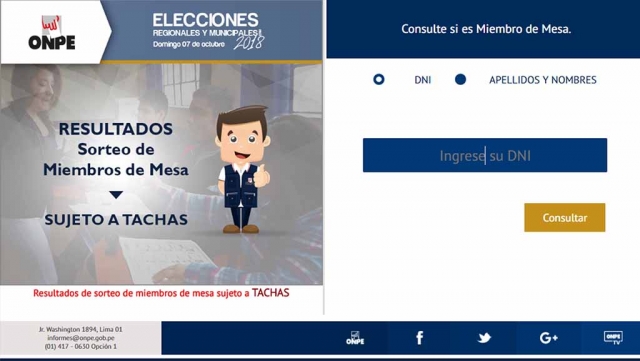 ERP. Comienza período de excusas. La Oficina Nacional de Procesos Electorales (ONPE) publicó la relación definitiva de miembros de mesa, titulares y suplentes, para los comicios regionales y municipales del 07 de octubre, a fin de que los ciudadanos sorteados puedan recoger sus credenciales, capacitarse o presentar sus documentos de excusa oportunamente.