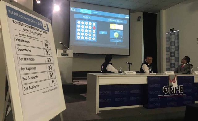 El sorteo se desarrolló en la sede central del organismo electoral con la presencia de representantes del Jurado Nacional de Elecciones (JNE), el Registro Nacional de Identificación y Estado Civil (RENIEC), la Defensoría del Pueblo, un notario público, entre otros.