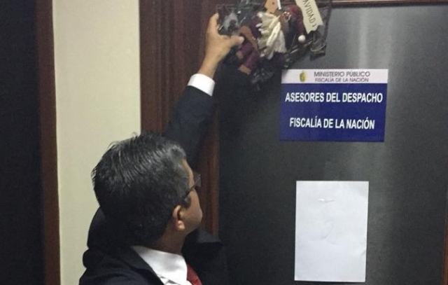El fiscal José Domingo Pérez y miembros de la Policía Nacional participaron en el allanamiento de los inmuebles ubicados en la sede principal del Ministerio Público, en el Cercado de Lima. José Domingo Pérez detalló que se dispuso el lacrado de las oficinas de Juan Manuel Duarte, asesor de Pedro Chávarry.