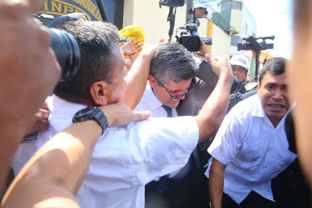 También fueron arrojados otros objetos contundentes y líquidos contra el representante del Ministerio Público. Llama la atención el descuido de la Policía Nacional del Perú para evitar que este tipo de hechos se produzcan.