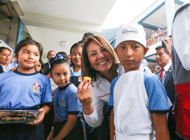 Junto a la ministra de Educación, Flor Pablo; el director ejecutivo de Qali Warma, Fredy Hinojosa; y el alcalde de La Victoria, George Forsyth, la titular del Midis supervisó la entrega del servicio alimentario escolar en la institución educativa César Vallejo. Dichas autoridades compartieron con los estudiantes de inicial el desayuno que incluyó un néctar de pera, huevo sancochado y un pan elaborado con cañihua, pasas y leche.
