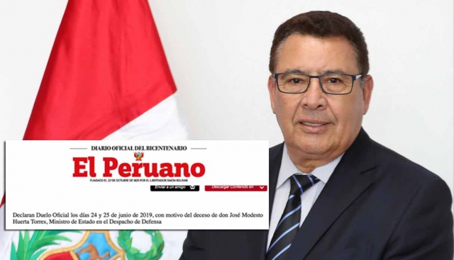 ERP. El gobierno declaró Duelo Oficial los días 24 y 25 de junio con motivo del deceso del ministro de Estado en el Despacho de Defensa, José Huerta Torres. Según un decreto supremo promulgado esta tarde, el Gobierno dispuso el izamiento del Pabellón Nacional a media asta en los edificios públicos, bases militares, busques de la Armada, establecimientos policiales y demás dependencias del Estado, en la capital de la República, durante el tiempo de las exequias.