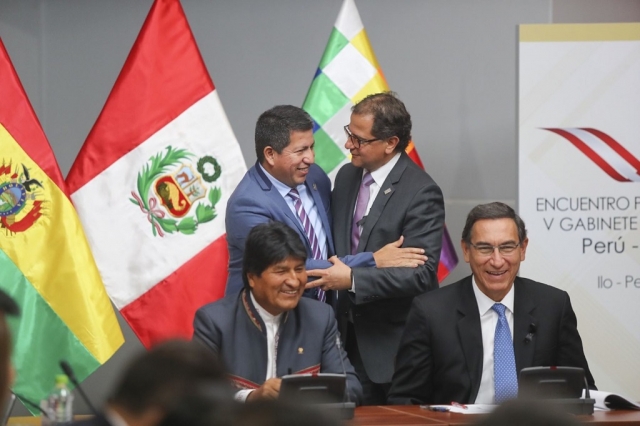 La reunión binacional, celebrada en la ciudad de Ilo, estuvo presidida por los mandatarios de Perú, Martín Vizcarra y de Bolivia, Evo Morales, cada uno acompañado por sus ministros de Estado.